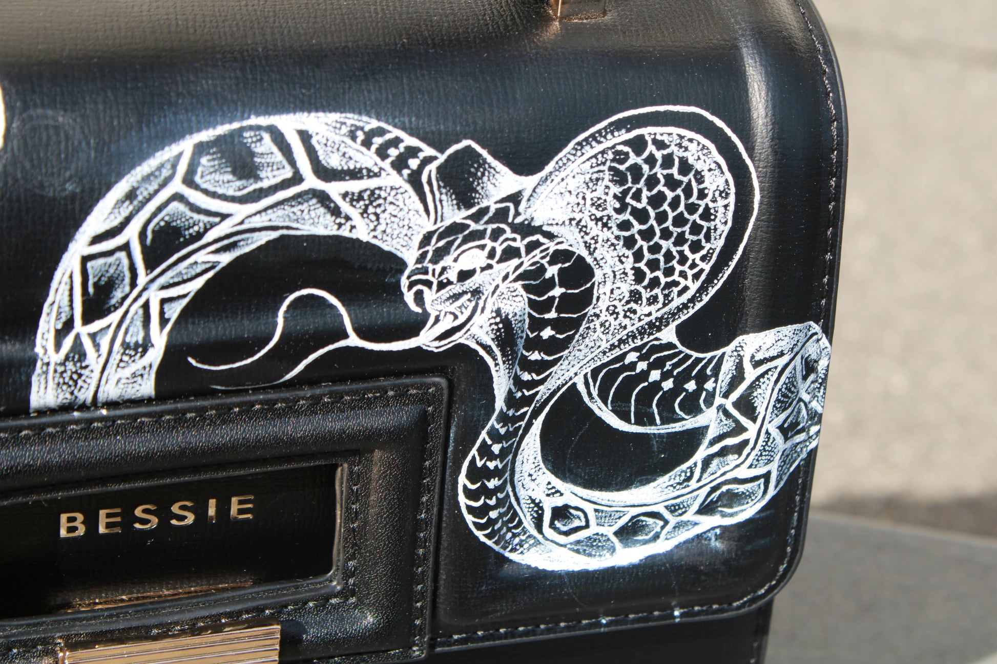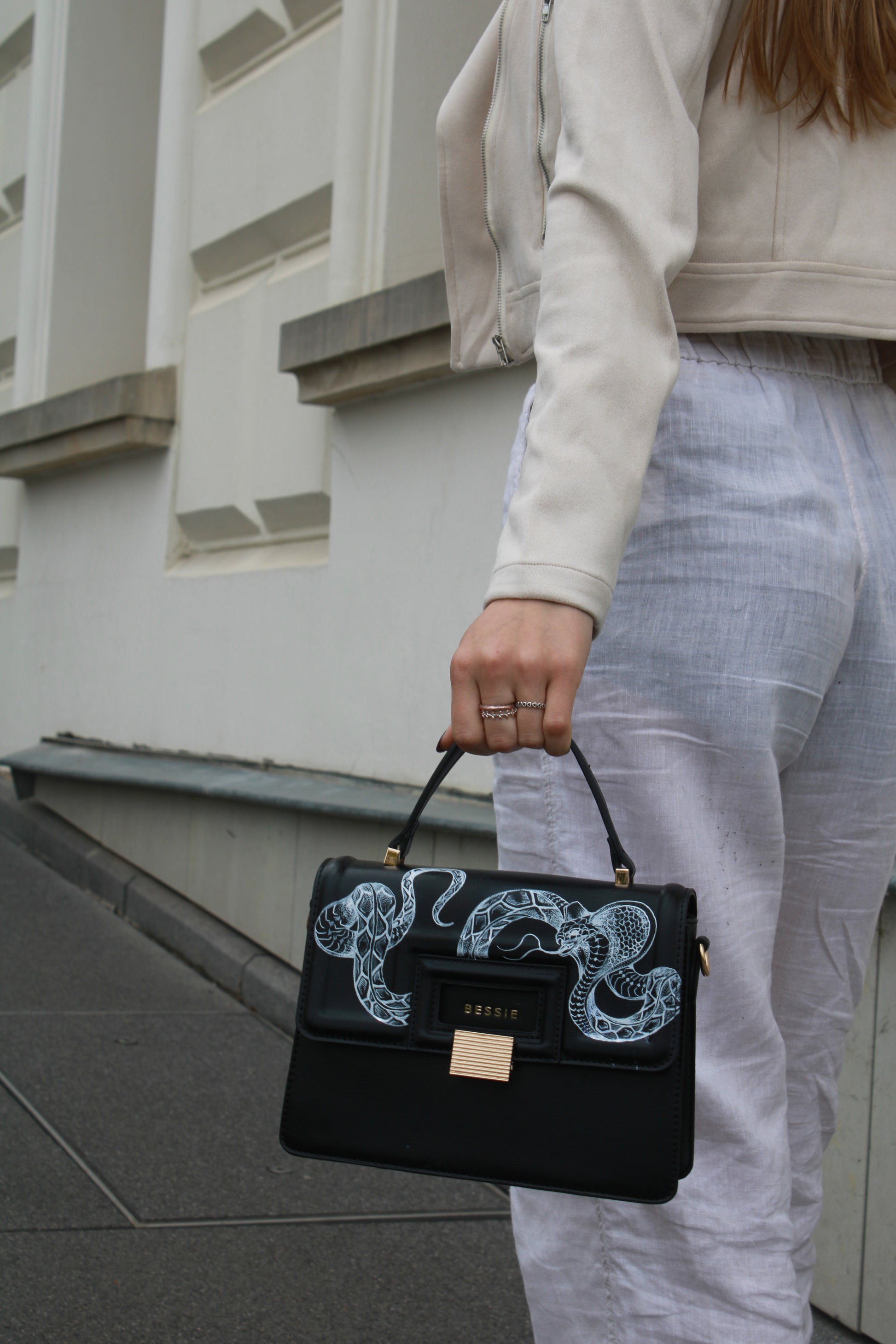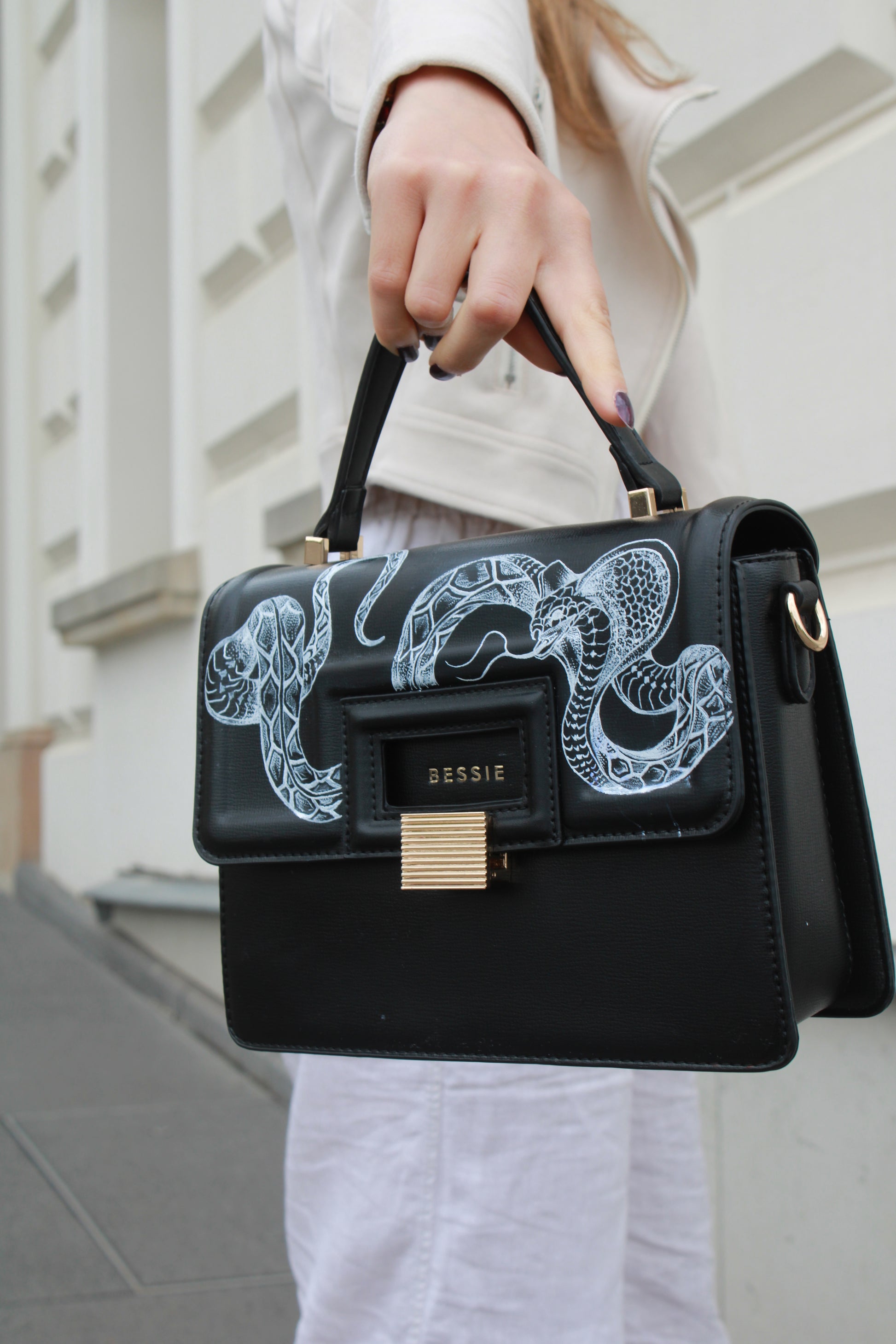 Diese kompakte Tasche besticht durch klare Linien und ein elegantes Schlangenmotiv.