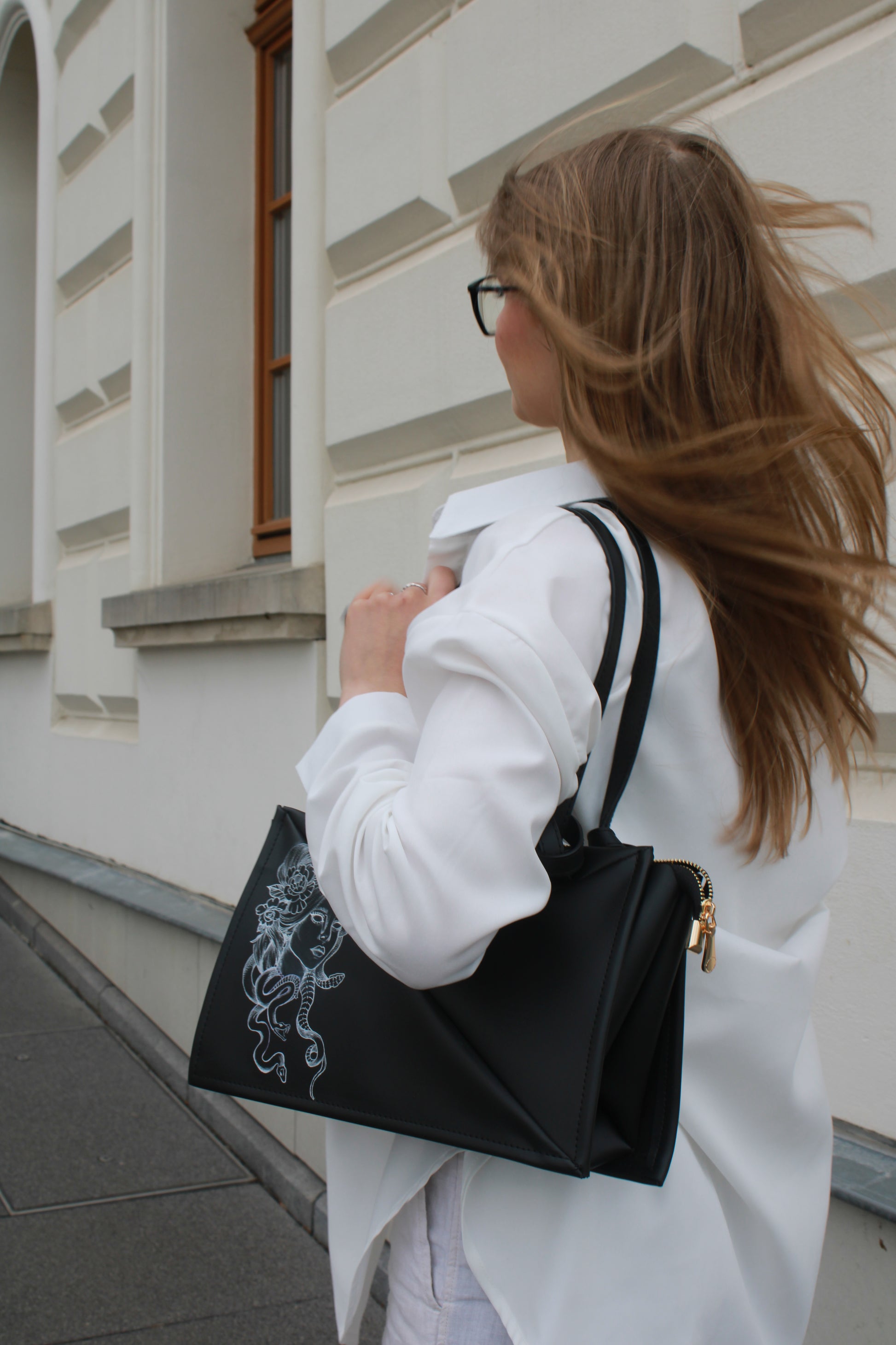 Die größere "No. 008 - ancient goddess" Tasche besticht durch ihr kraftvolles Medusamotiv, elegant umrahmt von einem kunstvoll geknöpftem Henkel. In dunklen Tönen gehalten, vereint sie ausdrucksstarke Ästhetik mit selbstbewusster Weiblichkeit.