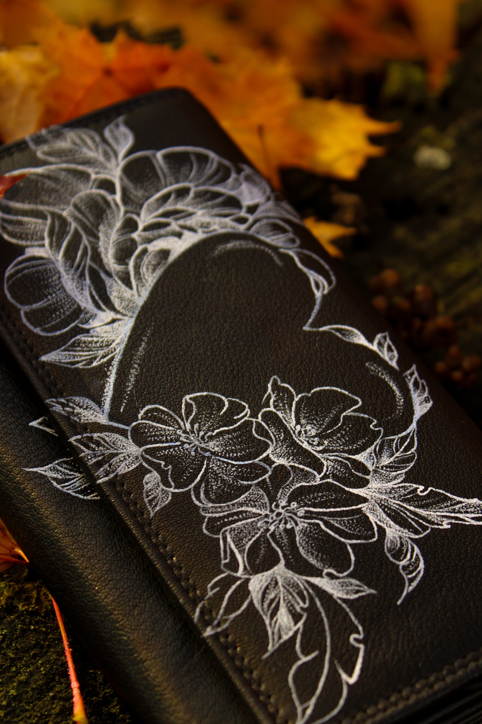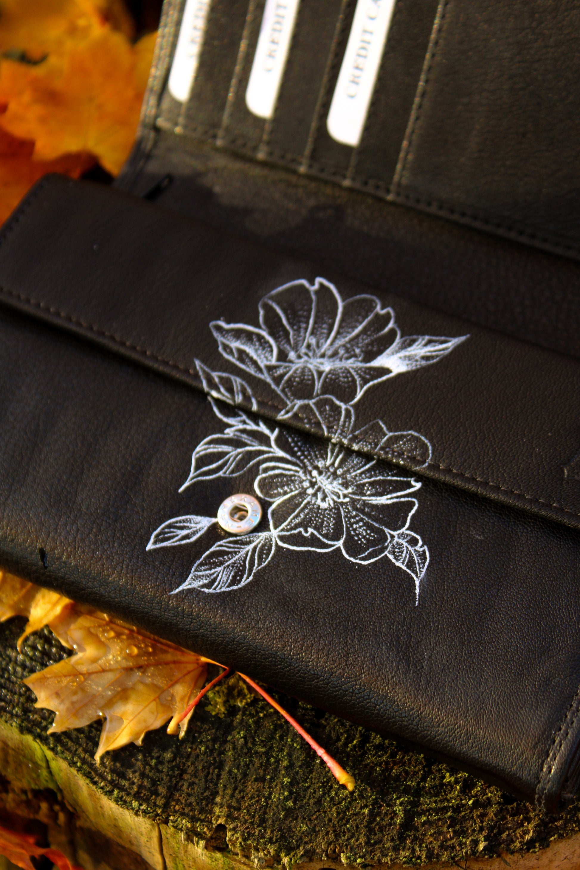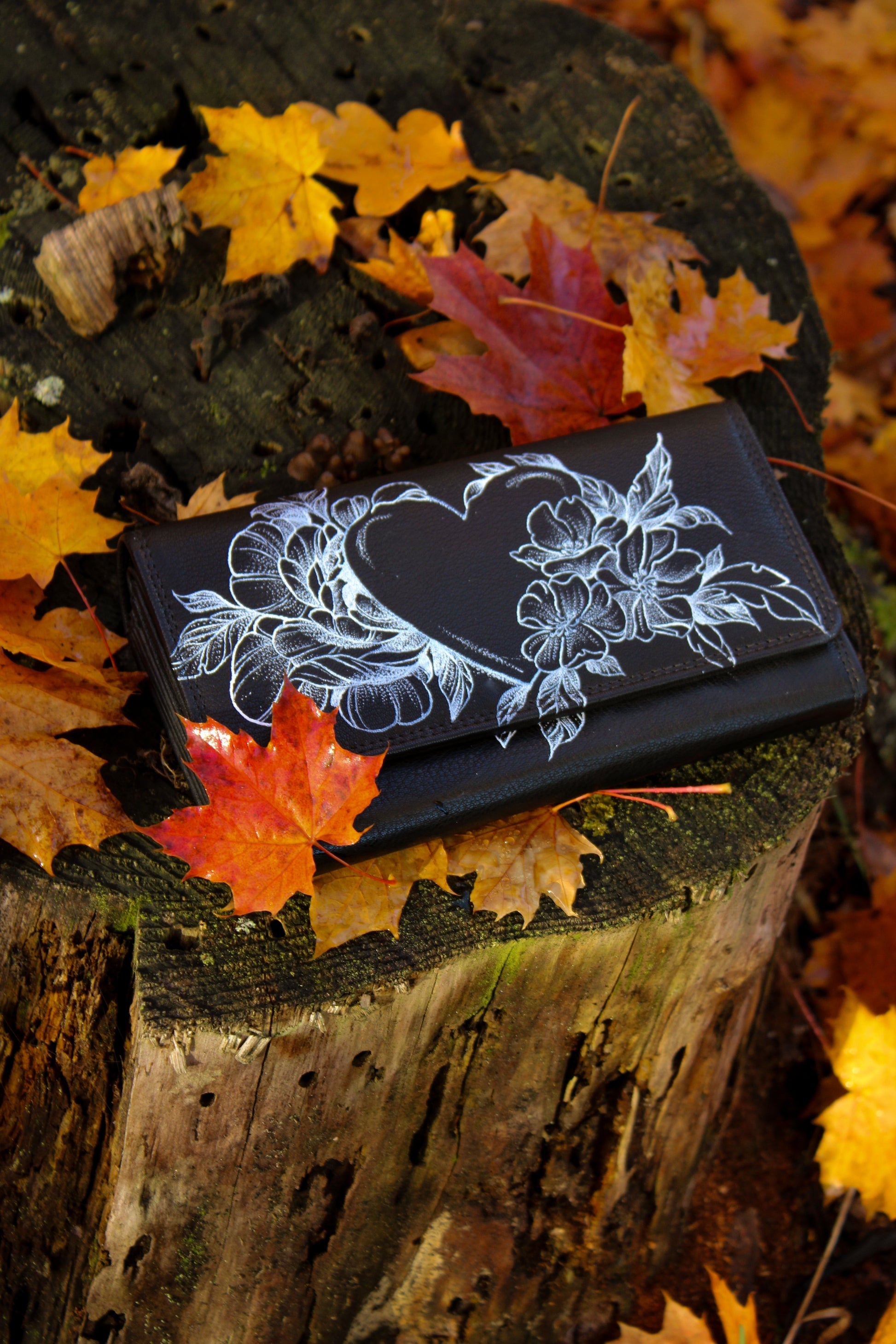 Ein feines, handgefertigtes Portemonnaie in tiefem Schwarz mit weißem, floralem Herzmotiv.